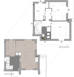 Ristrutturazione casa per vacanze con ridistribuzione zona giorno e servizi, realizzazione rivestimenti e pareti attrezzate in abete termico.