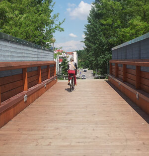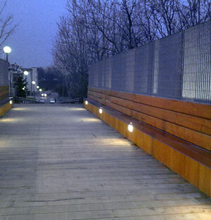 La nuova passerella in legno lamellare di scavalco della S.P. 139 è realizzata con travi in luce in legno lamellare di 1,20 di altezza per una lunghezza di 18 m. Verso l'interno la struttura diventa occasione per la formazione di una lunga seduta